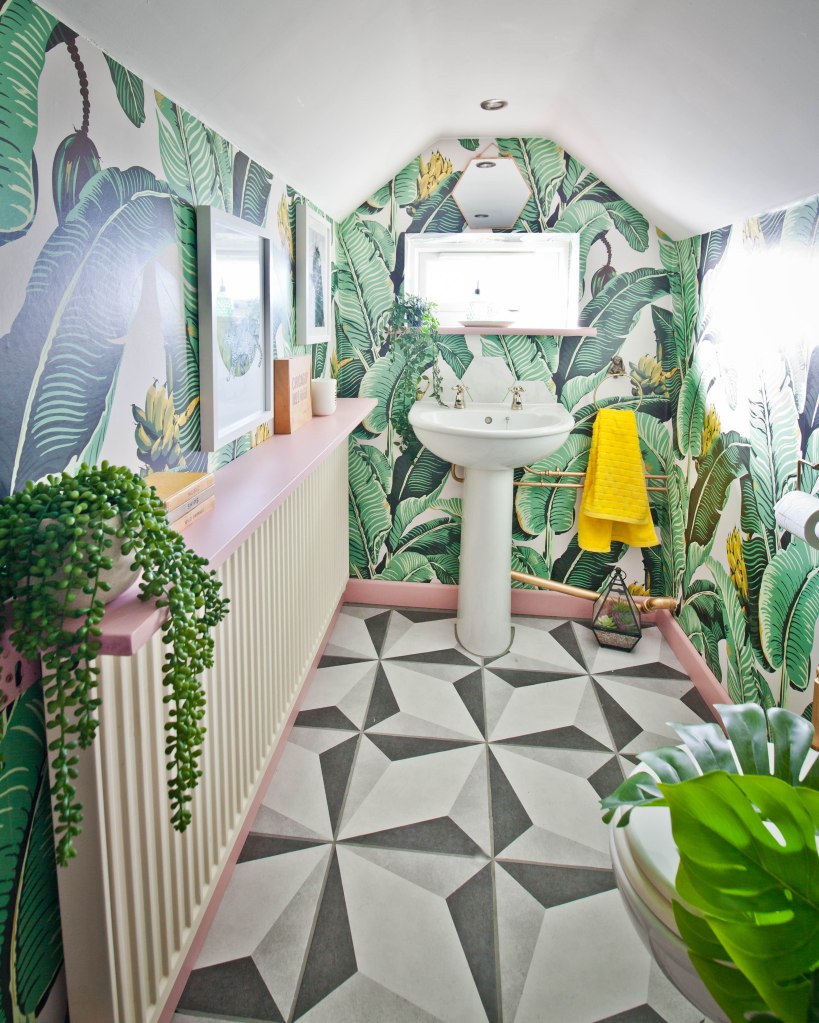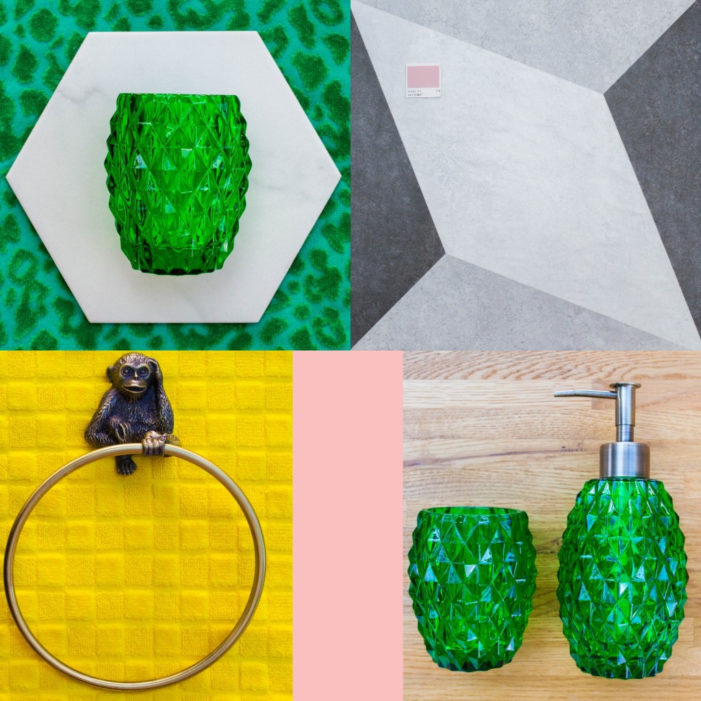 Even though I already had plenty of pattern coming from the floor tiles and the shape of the wall tiles, I knew my beloved tropical wallpaper would work well too because the neutral tones of the tiles could support the bold colours of the paper despite the pattern clash. I could then add my yellow and green towels, green woven baskets for storage (toys!), cut green glass soap dispenser and plenty of plants to accessorise the space.