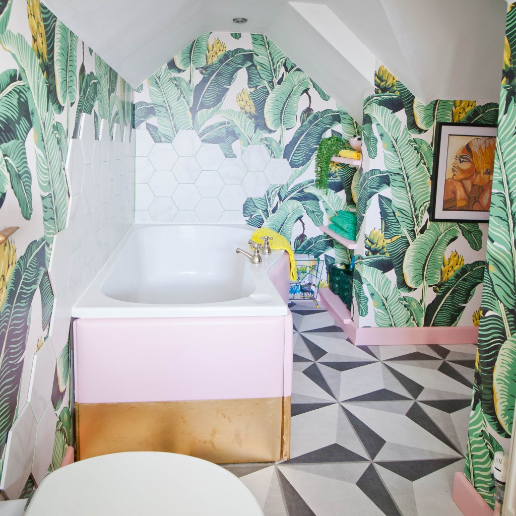 The final accent colour was pink and I really went to town painting the bath panel, the skirting boards, windowsill, shelves and cupboards before adding gold hardware and gold leaf to the base of the bath. I could never have dreamed this project would come together as well as it did but I learnt so much along the way and have really enjoyed creating a fun and original space that just makes me smile.